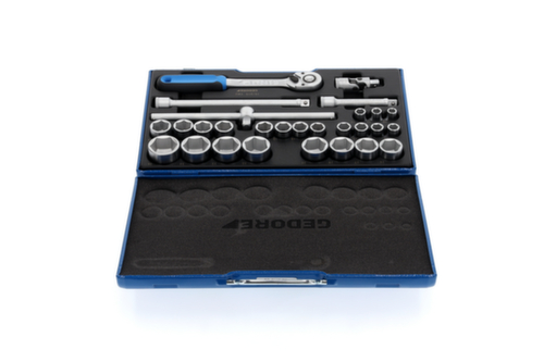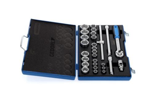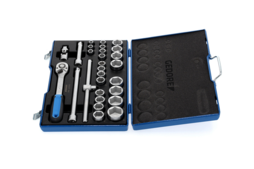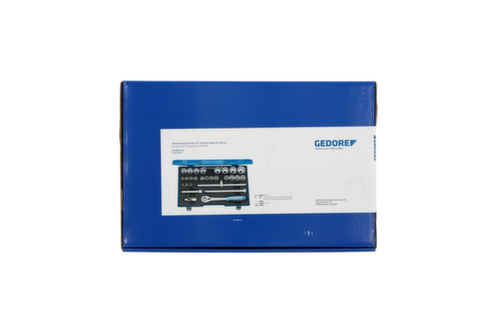 "longDescription": "Con bussole forgiate, temperate, azionate a mano, a profilo esagonale UD (n. 19) o a profilo UD a 12 punte (n. D 19), Con utensili di azionamento in acciaio al vanadio 31CrV3, Con robusto cricchetto a leva, con sblocco a pulsante, In valigetta GEDORE in lamiera d'acciaio blu, Dimensioni: 425 x 277 x 55 mm<br>",