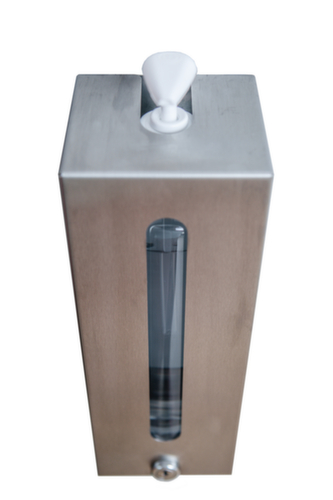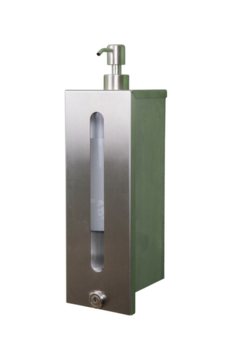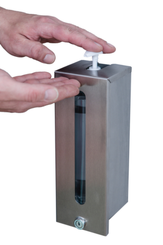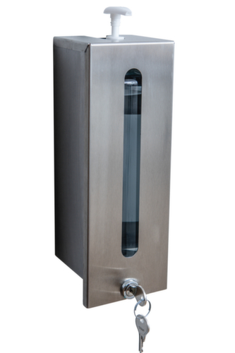 adatto a per qualsiasi disinfettante (a base alcolica), sapone liquido e in crema, lozioni e liquidi simili. con indicatore livello di riempimento, lucchetto. chiudibile con serratura di sicurezza. in acciaio inox.