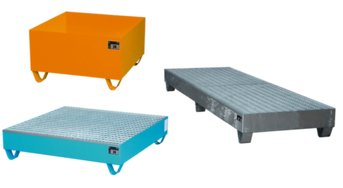 "longDescription": "<h2>Vasche di raccolta</h2><strong>per un immagazzinamento sicuro sotto il tetto</strong><br><ul><li>Idoneo per sostanze inquinanti e infiammabili</li><li>Robusta struttura in lamiera d'acciaio</li><li><strong>Adatto per il trasporto con carrelli elevatori</strong> grazie alla pratica altezza di ingombro</li></ul><br><strong>La scelta è vostra:</strong><br><ul><li><strong>Durevole o accattivante</strong> - superficie zincata a caldo o con verniciatura colorata</li><li><strong>Per un volume di raccolta ancora maggiore</strong>, in opzione con griglia rimovibile</li></ul><br><strong>Disposizioni!</strong><br><br>Struttura delle vasche approvata dalle autorità. Impiego per lo stoccaggio al coperto di sostanze inquinanti dell’acqua e infiammabili.<br>",