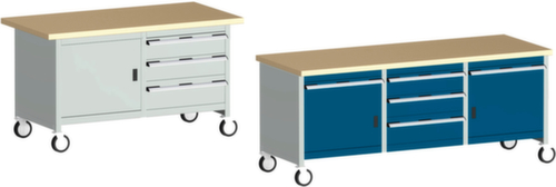"title": "bott Banco di lavoro mobile a scatola cubio, 5 cassetti, 2 armadi, RAL7035 grigio luce/RAL5010 blu genziana",