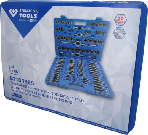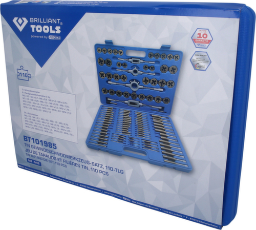 "longDescription": "<ul><li class=\"liste\">Set da 110 pezzi</li><li class=\"liste\">metrico</li><li class=\"liste\">M2 - M18</li><li class=\"liste\">per la produzione di filettature interne ed esterne DIN 352 - DIN 223</li><li class=\"liste\">Utensili da taglio rivestiti in titanio</li><li class=\"liste\">incluso pretaglio e ritaglio</li></ul><br />Il set di utensili per filettatura BRILLIANT TOOLS BT101985 è composto da 110 pezzi. Gli utensili da taglio rivestiti in titanio possono essere utilizzati per produrre filettature interne ed esterne da M2 a M18. Sono inclusi 2 maschi, pre e post, per ogni misura.<br /><br /><strong>Contenuto della fornitura:</strong><br /><br />1 chiave per rubinetto con impugnatura a T: M2 - M3<br />2 chiavi per rubinetti: M3 - M12, M6 - M20<br />2 portamaschi: M2 - M9, M10 - M18<br />35 Set di rubinetti manuali 2 pz: M2 x 0,4 mm - M3 x 0,5 mm - M4 x 0,7 mm - M5 x 0,8 mm - M6 x 0,75 mm - M6 x 1,0 mm - M7 x 0,75 mm - M7 x 1,0 mm - M8 x 0,75 mm - M8 x 1,0 mm - M8 x 1,25 mm - M9 x 0,75 mm - M9 x 1,0 mm - M9 x 1,25 mm - M10 x 0,75 mm - M10 x 1,0 mm - M10 x 1,25 mm - M10 x 1,5 mm - M11 x 0,75 mm - M11 x 1,0 mm - M11 x 1,25 mm - M11 x 1,5 mm - M12 x 0,75 mm - M12 x 1,0 mm - M12 x 1,25 mm - M12 x 1,5 mm - M12 x 1,75 mm - M14 x 1,0 mm - M14 x 1,25 mm - M14 x 1,5 mm - M14 x 2,0 mm - M16 x 2,0 mm - M16 x 1,5 mm - M16 x 1,0 mm - M18 x 1,5 mm<br />35 Fustelle: M2 x 0,4 mm - M3 x 0,5 mm - M4 x 0,7 mm - M5 x 0,8 mm - M6 x 0,75 mm - M6 x 1,0 mm - M7 x 0,75 mm - M7 x 1,0 mm - M8 x 0,75 mm - M8 x 1,0 mm - M8 x 1,25 mm - M9 x 0,75 mm - M9 x 1,0 mm - M9 x 1,25 mm - M10 x 0,75 mm - M10 x 1,0 mm - M10 x 1,25 mm - M10 x 1,5 mm - M11 x 0,75 mm - M11 x 1,0 mm - M11 x 1,25 mm - M11 x 1,5 mm - M12 x 0,75 mm - M12 x 1,0 mm - M12 x 1,25 mm - M12 x 1,5 mm - M12 x 1,75 mm - M14 x 1,0 mm - M14 x 1,25 mm - M14 x 1,5 mm - M14 x 2,0 mm - M16 x 2,0 mm - M16 x 1,5 mm - M16 x 1,0 mm - M18 x 1,5 mm<br /><br />LA NOSTRA QUALITÀ: BRILLANTE<br />I NOSTRI PREZZI: SMART<br /><br />Ogni utensile contiene oltre un quarto di secolo di esperienza dei nostri esperti. Questa qualità senza compromessi, strumenti professionali di altissima qualità per il duro lavoro quotidiano, è una delle nostre ricette per il successo. Non disponiamo di una grande struttura di vendita e di stravaganti attività di marketing e possiamo quindi offrirvi i prodotti a un rapporto prezzo/prestazioni sensibilmente vantaggioso. Risparmiate senza abbassare i vostri standard di qualità!<br /><br />Un utensile di qualità powered by KS TOOLS.<br /><br>",