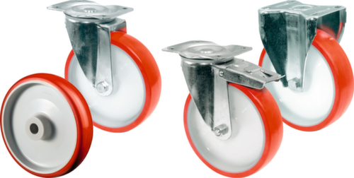 "longDescription": "<h2>Ruote in poliuretano</h2><strong>con corpo ruota antisfondamento</strong><br><ul><li><strong>Durevole e antiruggine</strong>: scatola dello sterzo e forche a cavalletto in lamiera d'acciaio zincata.</li><li>Cerchio in plastica</li><li><strong>Alta resistenza e bassa rumorosità di marcia</strong> - con pneumatici in poliuretano</li><li><strong>Senza manutenzione e senza intoppi</strong> - mozzo con cuscinetti a rulli</li><li>Gruppo di sfere e gabbie a doppia corona nella testa della forcella</li></ul>",