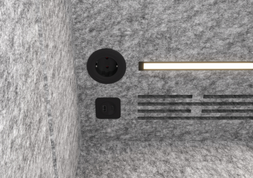 "html": "<h2>Attrezzature elettriche moderne per un lavoro produttivo</h2><p>La soluzione silent space room-in-room offre tutto il necessario per lavorare in mobilità: Una presa da 220 V e le moderne porte USB-A e USB-C (16 W ciascuna) consentono di ricaricare contemporaneamente laptop, smartphone e altri dispositivi, senza bisogno di adattatori aggiuntivi.\nL'elegante integrazione delle connessioni nel soffitto e il posizionamento ben studiato garantiscono una superficie di lavoro ordinata. Così sarete sempre connessi, efficienti, moderni e indipendenti.</p>",