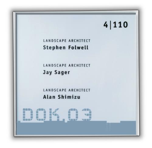 "longDescription": "<h2>Cartello della porta</h2><strong>per facilitare l'orientamento</strong><br><ul><li><strong>Flessibilità assoluta</strong> grazie agli inserti di carta facilmente intercambiabili</li><li><strong>Protezione dalla polvere</strong> - vetro acrilico</li><li><strong>Intramontabile e robusto</strong> - telaio in profili di alluminio ad alta resistenza</li></ul><br><strong>Nota bene!</strong><br><br>Per rendere ancora più semplice l'etichettatura dei cartelli, ordinate direttamente il software di progettazione e gli inserti corrispondenti!<br>",