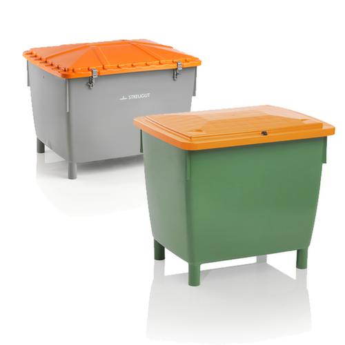 "description": "400l, AxlxP 930x968x776mm, HDPE, grigio, coperchio arancione, pareti chiuso, piedi, inforcabile",