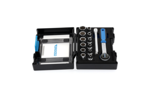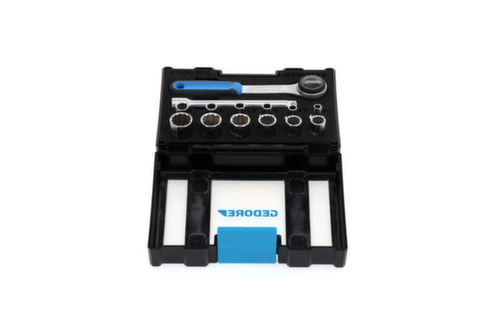 "longDescription": "Con bussole manuali a 12 punte con profilo UD e utensili di azionamento in acciaio al vanadio 31CrV3, Con cricchetto reversibile a denti extra fini, In valigetta di plastica, Dimensioni: 160 x 95 x 38 mm<br>",