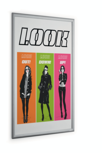 telaio in alluminio anodizzato in argento. angoli smussati. parte anteriore in pellicola protettiva contro raggi UV. parete posteriore in polistirolo resistente agli urti. retro con strisce autoadesive. fornitura: incluso materiale di montaggio.