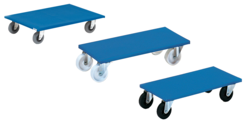 "description": "carico max. 350kg, Lxl sup. carico 600x300mm, piastra di compensato, blu, 4ruote orientabili, gommatura in poliammide",
