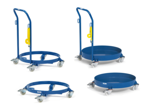 "description": "carico max. 250kg, sup. carico Ø 630mm, 1x fusto 200l, c. bordo, acciaio, RAL5007,4ruote orientabili",