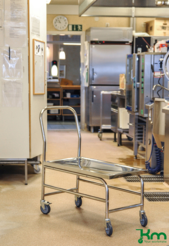 struttura in acciaio inox. piattaforma di acciaio inox. piattaforma chiuso. Facile da manovrare e spostare grazie alle 4 ruote orientabili, 2 ruote con freno. Ø ruota 100 mm. mozzi con cuscinetto a sfere di precisione.