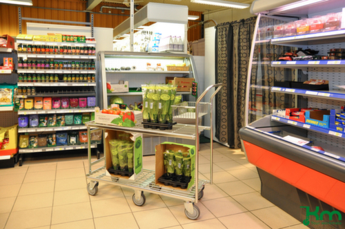 struttura in acciaio. piattaforma traforato con ripiano a griglia. maniglione di spinta con cesto per raccogliere e trasportare separatamente gli oggetti più piccoli. telaio zincato con elettrolisi. Facile da movimentare grazie al robusto carrello da 4 ruote orientabili e 2 ruote fisse, I fermi sulle due ruote orientabili garantiscono sempre un appoggio sicuro in caso di necessità. Ø ruota 125 mm. ruote con gommatura in TPE salva-pavimento. mozzi con Cuscinetto oscillante. Consente la rotazione a 360°.