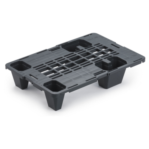 "metaDescription": "Mini pallet, polietilene, lunghezza x larghezza 600 x 400 mm - PE, AxLxl 115x600x400mm, carico max. statico 600kg, piano superiore traforato, grigio",
