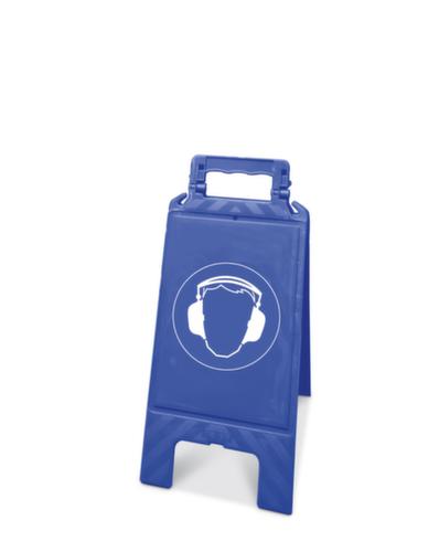 "description": "obbligo di usare le protezioni dell'udito, cartello da terra, plastica, blu, AxlxP 600x275x270mm",