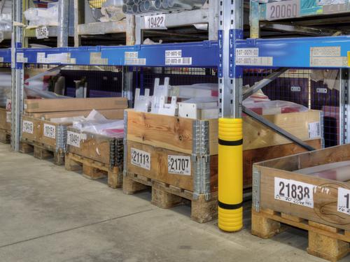 "metaDescription": "Moravia Protezione anticollisione degli scaffali ,altezza 550 mm - AxlxP 550x126x104mm, p. l sost. scaffale 60-85mm, PE, giallo, c. chiusura a strappo",