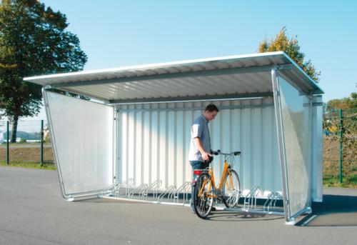 "description": "p. tettoia per biciclette, applicazione destra, parete lamiera trapez. zincato/verniciato a polvere, RAL9002, sovrapprezzo",