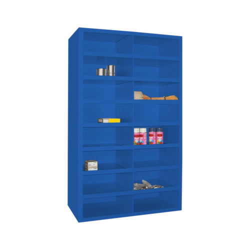 16 scomparti offrono spazio sufficiente per riporre separatamente documenti, materiale di consumo o pezzi di ricambio. 2 scomparti per piano. scomparti con bordo di contenimento (40 mm) e fascia per etichette integrata. struttura in lamiera di acciaio con verniciatura a polvere a prova di urti e graffi. piani con verniciatura a polvere a prova di urti e graffi.