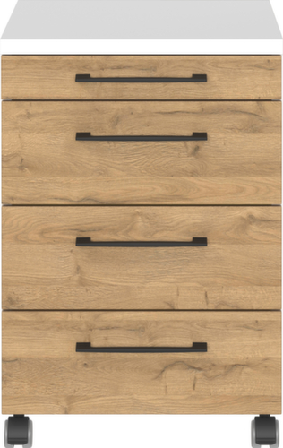 "description": "AxlxP 610x420x490mm, 1cass. portapenne, 3cassetto/i, metallo-maniglia curva, nero, corpo bianco, parte ant. quercia Grandson, 4ruote orientabili",