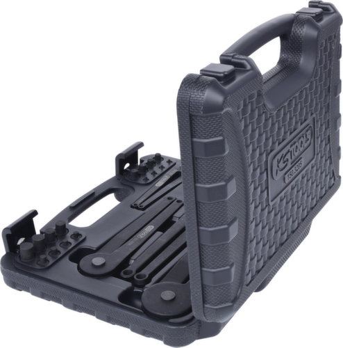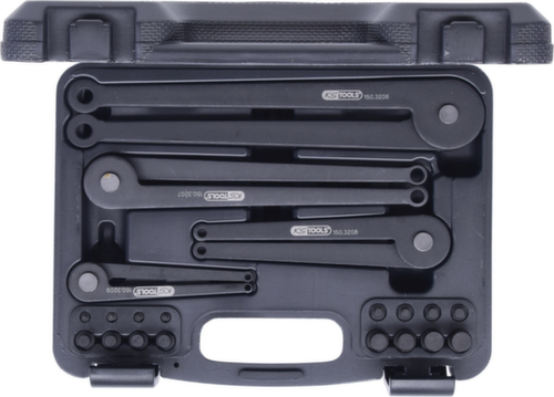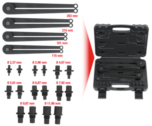 "longDescription": "universalmente applicabile per i comuni dadi a due fori, con coppie di spigot intercambiabili, ogni cacciavite per dadi a due fori sostituisce 4 misure di chiave individuale, regolabile in continuo nel diametro, fosfatato, acciaio speciale per utensili, in robusta custodia di plastica<br>",