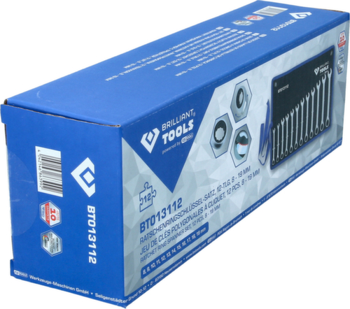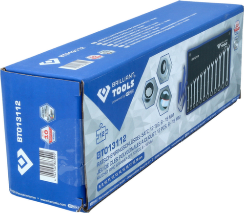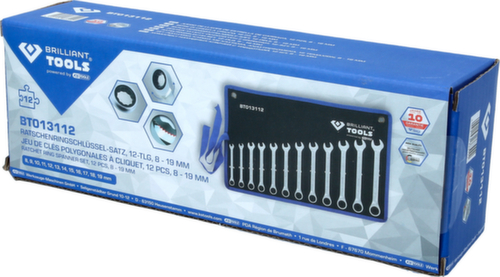 "longDescription": "Set di 12 pezzi, fabbricato secondo la norma DIN 3113, dentatura fine con 72 denti, angolo d'inversione di 5°, forma diritta, cromato opaco, cromo vanadio, in pratica borsa di conservazione con occhielli per appendere,Il set di chiavi a cricchetto BT013112 di 12 pezzi BRILLIANT TOOLS è fabbricato secondo la norma DIN 3113. Le chiavi a cricchetto metriche sono a denti fini con 72 denti e hanno un angolo di inversione di 5°. Le chiavi hanno una forma dritta e una posizione delle ganasce di 15°. La superficie è cromata opaca, il che la fa sentire particolarmente bene in mano. Il set di chiavi ad anello a cricchetto con misure da 8 mm a 19 mm è fornito in una pratica borsa di stoccaggio che è dotata di occhielli per appendere.,,Inclusi nella consegna: 8 mm, 9 mm, 10 mm, 11 mm, 12 mm, 13 mm, 14 mm, 15 mm, 16 mm, 17 mm, 18 mm, 19 mm LA NOSTRA QUALITÀ: BRILLANTE,I NOSTRI PREZZI: SMART,In ogni strumento c'è più di un quarto di secolo di esperienza dei nostri esperti. Questa qualità senza compromessi, strumenti professionali con la massima qualità per il duro lavoro quotidiano, è una delle ricette del successo per noi. Facciamo a meno di una grande struttura di vendita e di attività di marketing stravaganti e possiamo quindi offrirvi i prodotti ad un rapporto prezzo/prestazioni sensazionalmente favorevole. Risparmiate soldi senza abbassare i vostri standard di qualità!,Uno strumento di qualità alimentato da KS TOOLS.<br>",