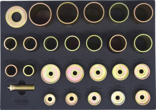 "longDescription": "per il montaggio e lo smontaggio di cuscinetti, boccole e giunti di supporto, l'adattatore e l'albero di pressione consentono l'uso con il supporto universale per presse (440.0180), 24 manicotti a pressione di diverse dimensioni, 61 diversi diametri interni ed esterni tra 30,5 mm e 79,7 mm, applicazione universale per auto e furgoni, ottimo uso anche con presse da officina, acciaio speciale per utensili<br>",