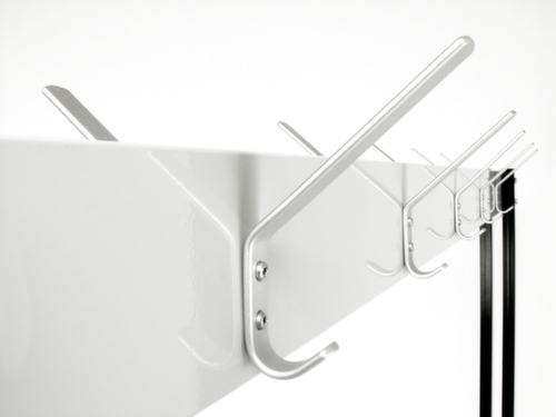 "description": "mobile, AxlxP 1800x1500x600mm, 10gancio cappelli/10cappotti/10borse, 4ruote orientabili, acciaio/allum., RAL7035/RAL7035",