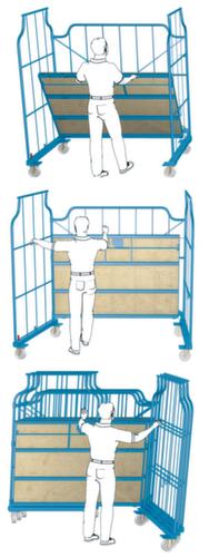 "description": "carico max. 800kg, AxLxl 1850x1150x1200mm, 3pareti, largh. maglia 500x260mm, RAL 5012, gommatura in poliammide",