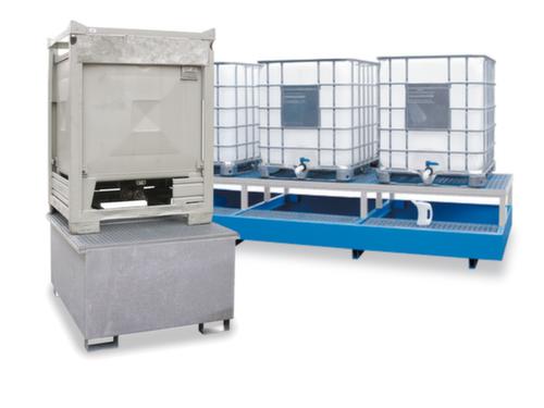 "description": "p. 2xIBC, capacità raccolta 1000l, AxlxP 745x2680x1400mm, c. supporto di riempim., griglia, acciaio zincato",