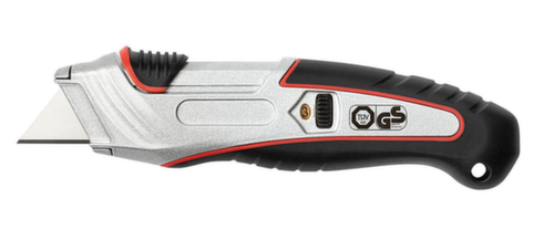 "longDescription": "<h2>Cutter di sicurezza</h2><strong>con riavvolgimento automatico delle lame</strong><br><ul><li>Adatto a mancini e destrimani</li><li>Impugnatura in metallo ergonomica con zona di presa gommata</li><li>Lama a molla con rientro automatico al venire meno del contatto con l'oggetto da tagliare</li><li>con ruota di regolaz., profondità di taglio regolabile in 3 livelli: 9 mm, 15 mm e 25 mm</li><li>Cambio lama semplice con elemento scorrevole di sicurezza</li><li>Con foro di aggancio</li></ul><br><h3>Fornitura:</h3><ul><li>Incl. 5 lame di ricambio trapezoidali in acciaio al carbonio SK5</li></ul><br><h3>Marchio di controllo/conforme a:</h3><ul><li>Marchio GS - Certificato TÜV</li></ul>",